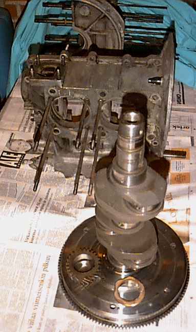 The crankshaft has been assembled with rods, bearings, gears etc.