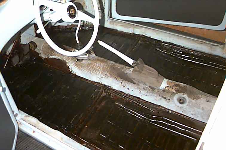 The interior I did myself from the scratch, and I was doing that for the first time, so I took a lesson there. It was made from black feltmat, and after all it looks ok. First I painted the floor with anti-rust paint, next layer was bitumen, which was shaped with hot air blower. Then a layer of thick sound absorbing sheet and then the mat. And of course on top of all the mud carpets.